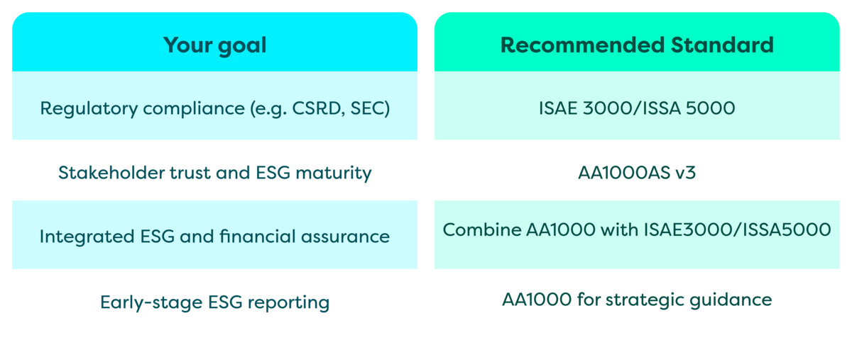4. How do I choose between AA1000, ISAE 3000, and ISSA 5000?