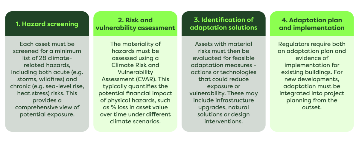 The EU Taxonomy, serving as a classification system for sustainable investments, offers a clear and detailed framework for assessing physical climate risks in real estate. It is particularly important for compliance with the Corporate Sustainability Reporting Directive (CSRD) and the Sustainable Finance Disclosure Regulation (SFDR).