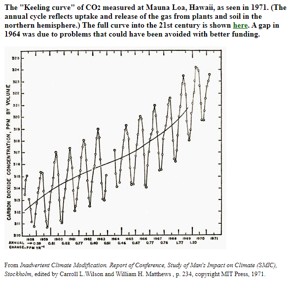 Lack of funds soon closed down the Antarctic station, but Keeling managed to keep the Mauna Loa measurements going with only a short hiatus. As the CO2 record extended, it became increasingly impressive, in those days increasing by about 5 ppm per decade. Today the rate of increase is 25 ppm per decade.