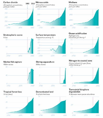 Even by the 1950s, it was not foreseeable how rapidly and intensively the industrialisation started by a few countries in 1750 would spread globally over the next 70 years. This is now known as the great acceleration; since 1950, it has supercharged impacts on both earth system and socio-economic trends as shown by the graphics below.