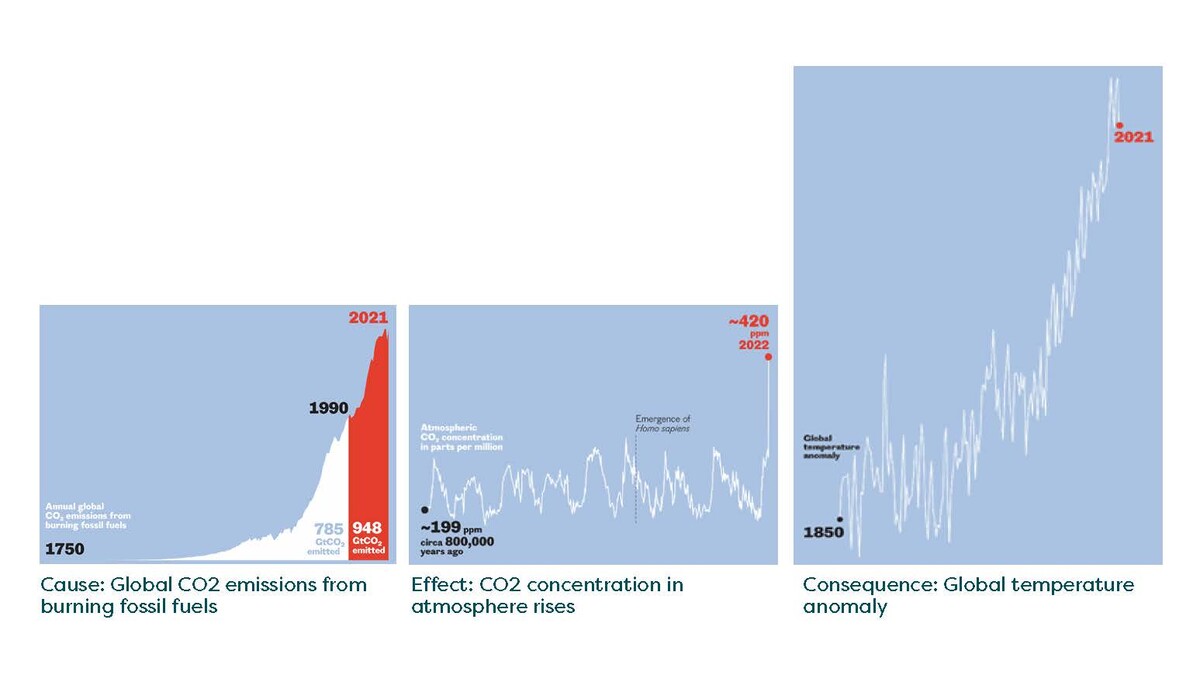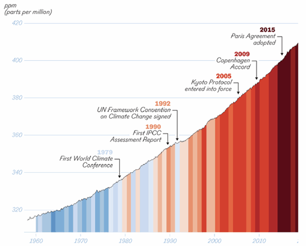 To start at the beginning, in 1896 Svante Arrhenius, a Swedish chemist, and direct ancestor of Greta Thunberg, published a paper hypothesising that by releasing CO2 into the atmosphere through burning coal, humankind would gradually warm Earth by several degrees….….he was only too right. The evidence is apparent from the three graphs below. The scale (and ‘wickedness’) of the existential challenge this sets humanity is perhaps most starkly driven home by the fact that global CO2 emissions in the 30 years since the first IPCC AR in 1990 greatly exceed all emissions in the 240 years prior to that. The signal could not be clearer, but the response so far (at a global level) has not been adequate. And as time passes without a stronger response, even more radical change will become necessary and yet therefore less palatable.