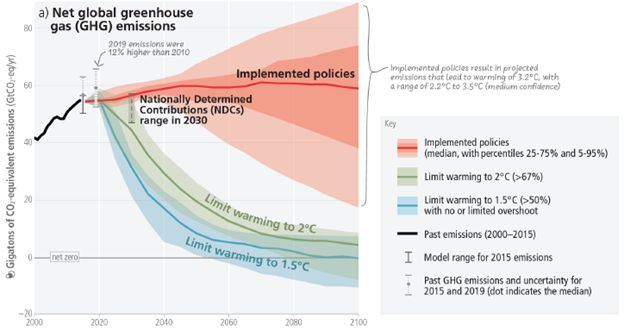It needs to be said that although the world is today experiencing the impacts of about 1.2⁰C warming, and these are severe enough, the existential threat is foreseen as a possibility/probability/certainty (choose your word depending your optimistic or pessimistic nature) in the future, specifically within the typical lifespan of someone born today (rather than the much longer term of the 22nd century or beyond). The risks are assessed by climate models. The current scientific (IPCC) consensus was summed up at the COP27 summit at Sharm el-Sheikh, Egypt in November 2022 by none other than the Secretary General of the UN, Antonio Guterres: “We are on a highway to climate hell with our foot still on the accelerator”. The basis for such a dramatic if not hyperbolic statement was the latest IPPC modelling which shows current policies are heading to 3.2⁰C warming by 2100. This is evidenced by the graphic below showing the expected level of future greenhouse gas emissions up to 2100.