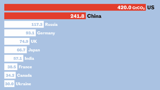 It is undeniable that responsibility for historical emissions is not shared equally. At a national level, a few countries stand out as vastly more responsible for historical emissions than others. The highest 4 emitters have produced a half of the historical total, whilst the top 10 are responsible for over two thirds.
