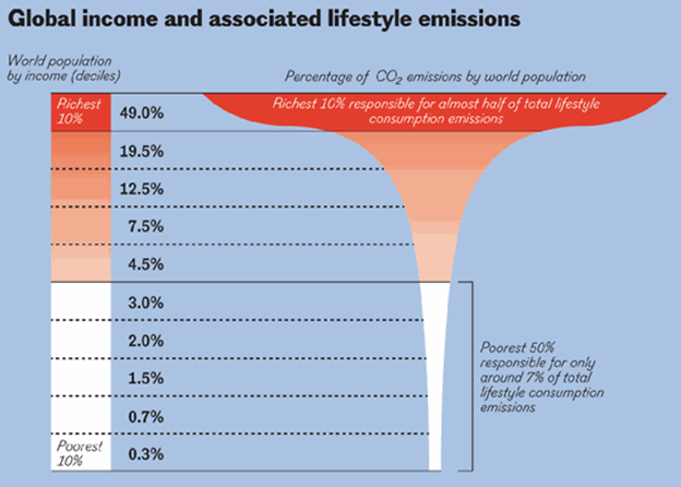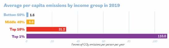 Obviously, any narrative around country level emissions must be nuanced by their population numbers over the accounting period. And it is probably more useful to compare the emissions of each member of the human race. For example, it is estimated that almost half (49%) of the world’s current annual total emissions are created by just 10% of humanity; and 15% of the total is produced by the richest 1%, as illustrated in this graphic: