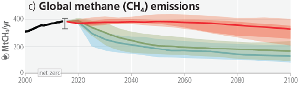 By contrast, warming produced by atmospheric CH4 reflects the current rate of emissions and cutting methane emissions results in near immediate temperature declines. The IPCC says we need to cut anthropogenic methane emissions by half by 2050 to reach net zero by that date. The graphic below illustrates again how that means a massive change in direction from the path (red line) expected under current policies: