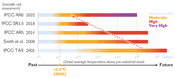 A significant underlying cause of this rather bleak picture seems to be that as climate models get better (more understanding and realistic representation of the complex physical processes, massive increases in the computing power available), their projections of the risks of severe impacts become more pessimistic. With each new IPCC assessment, while warming has increased due to rising GHG emissions, the science is showing the temperature threshold of high risk has gone down (see graphic below). Less than a decade ago, 2⁰C was seen as an “acceptable” target. Now it is categorised as a dangerous risk – the reason why the world is now desperately trying to ‘keep 1.5 alive’.