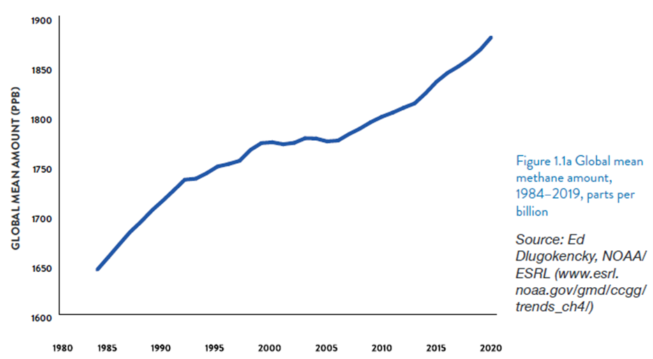 A UNEP Global Methane Assessment in 2021 predicted that globally, anthropogenic methane emissions are expected to continue to increase under current policy scenarios by 15% by 2030. This is somewhat out of alignment with the IPCC prediction of flatlining to 2050 shown in the above graphic.
