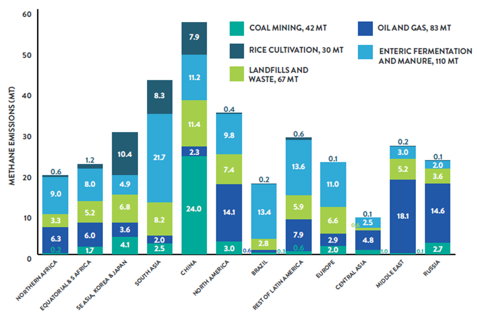 About 95% of total global methane emissions from anthropogenic sources come from just 3 sectors: fossil fuels 35%, agriculture 40% and waste (landfill) 20%. The sources are spread across the world as shown in this graphic.