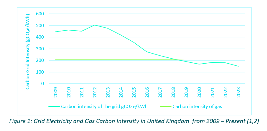 Figure 1 illustrates how much the carbon intensity of the grid in the UK has been dropping over the last 20 years due to the uptake of renewable energy and lower carbon intensive fossil use for power generation. The carbon emission per kWh of grid electricity has fallen by 70% from 2010 to 2023.
