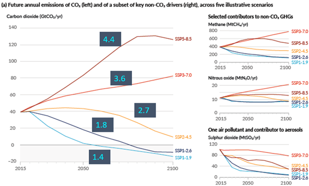 How certain are the outlooks for future climate impacts? The evidence comes from the IPCC’s 6th Assessment Report (AR6). (7) Taken from this report, Figure 1 shows five scenarios or SSPs (Shared Socioeconomic Pathways) which represent potential futures which follow very low to very high emissions pathways and result in correspondingly relatively modest to apocalyptic rises in global surface temperature by 2100: the best estimates being increases of 1.4, 1.8, 2.7, 3.6 and 4.4 °C above the average pertaining in 1850–1900. The pathways are labelled by the range of radiative forcing values they each produce in the year 2100, respectively 1.9, 2.6, 4.5, 7.0, and 8.5 W/m2.