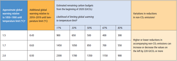 The middle pathway (SSP2-4.5) has emissions roughly flatlining to 2050 and clearly shows that the Paris Treaty commitment to limit the temperature rise by 2100 to 2°C becomes impossible if emissions have not fallen dramatically by 2050: it creates a 2.7°C rise. The only pathway that makes 1.5°C come to pass (SSP1-1.9) requires net zero to be reached by 2050, and then substantial amounts of negative emissions throughout the 2nd half of this century. These actually claw back the temperature rise by 2100 to 1.4°C from 1.5°C in 2040 and 1.6°C in 2060. The likelihood of achieving SSP1-1.9, or even SSP1-2.6, which limits the temperature rise to 1.8°C in 2100, is dependent on the future, starting now, being very different from the past (i.e. a discontinuity in the curve at 2020). If 1.5 is alive, it is hanging in there by a thread, a sword of Damocles hanging over it held by a single hair. The table below from IPCC AR6 confirms the remaining carbon budget with a better than evens chance (67%) of staying within 1.5 is around 400 GtCO2, just 10 years’ worth of current emissions: