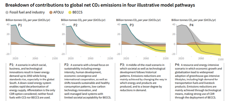 Figure 1: Breakdown of contributions to global net CO2 emissions in four illustrative model pathways (Source:IPCC).