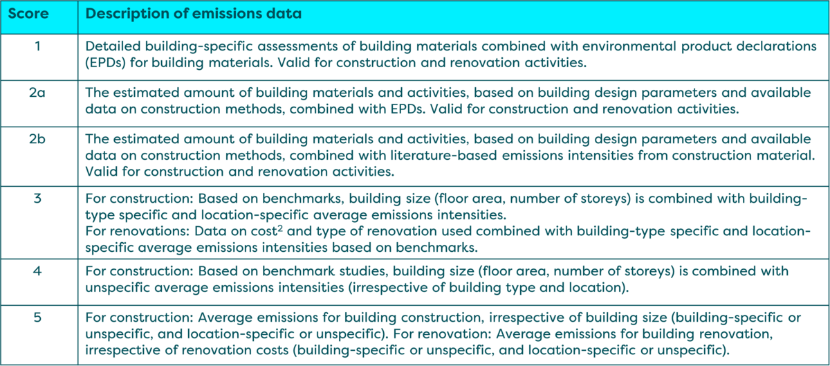 These datasets approximate embodied emissions during construction, covering diverse building types and materials. The data quality hierarchy offered by PCAF, ranging from 1 (most preferred) to 5 (least desired), guides users in estimating embodied carbon with varying degrees of accuracy. Despite the acknowledged variability and approximations due to building composition and design differences, these datasets represent a valuable resource for stakeholders seeking insights into embodied emissions, especially when actual data is unavailable.