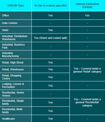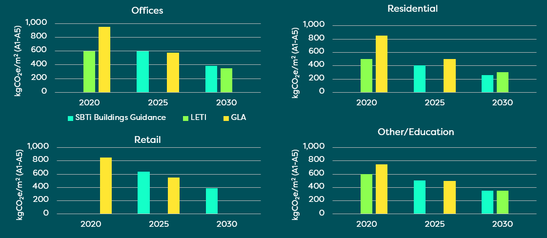 Embodied emissions targets only cover upfront emissions [A1-A5] for newly constructed buildings only and are only provided for three specific property types, (offices, residential and retail) with all others being classified as ‘other’.