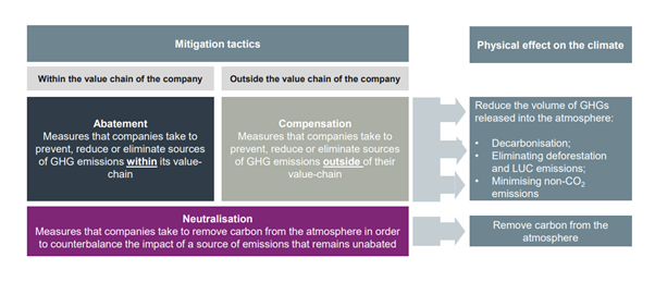 A company will need to balance carbon ‘abatement’ (reduction in emissions) with ‘neutralisation’ (carbon removals) - see Figure 1. The abatement part will need to follow a science-based trajectory. The neutralisation part can happen directly within their value chain or beyond. As carbon capture and storage has yet to become commercially available at scale, options for direct removals in the near term are likely to be restricted to nature based solutions on company-owned land as part of Scope 1 reporting. The GHG Protocol Land Sector and Removals Initiative is set to provide reporting guidance for this in Q3 2021.