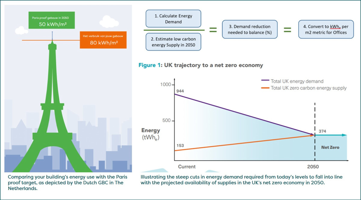 The approach is built on the assumption that building energy use will be constrained by the availability of national supplies of zero carbon (ZC) energy, essentially energy sources not creating CO2 emissions released to the atmosphere arising from the combustion of fossil fuel, such as renewables and nuclear (CCS may emerge in due course). For commercial offices, this led to the incorporation into the Framework of energy efficiency thresholds which assets or portfolios must comply with as one of the steps to a verified net zero designation. The methodology used to quantify these thresholds was the ‘Paris Proof Concept’, originated in 2018 for The Netherlands by the Dutch GBC, and applied to the UK. This determines the necessary ambition to achieve the goals of the Paris Climate Agreement, as illustrated in the diagrams below.